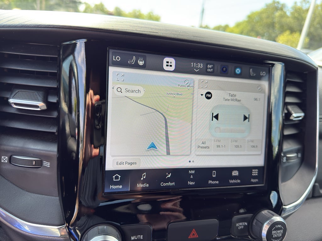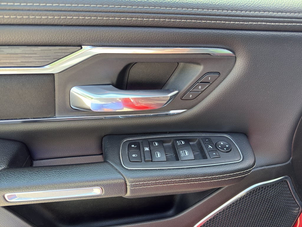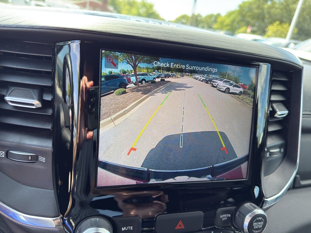 This model offers Automatic Climate Control for personalized comfort. Bluetooth® technology is built into this model, keeping your hands on the steering wheel and your focus on the road. The Ram 1500 comes equipped with Android Auto for seamless smartphone integration on the road. Start this unit from inside with remote start. Apple CarPlay: Seamless smartphone integration for the Ram 1500 - stay connected and entertained on the go! See what's behind you with the back up camera on this Ram 1500. Keep your hands warm all winter with a heated steering wheel in this unit . The leather seats in it are a must for buyers looking for comfort, durability, and style. The installed navigation system will keep you on the right path. It excites both driver and bystanders with a polished red exterior with racy lines. Maintaining a stable interior temperature in this vehicle is easy with the climate control system.